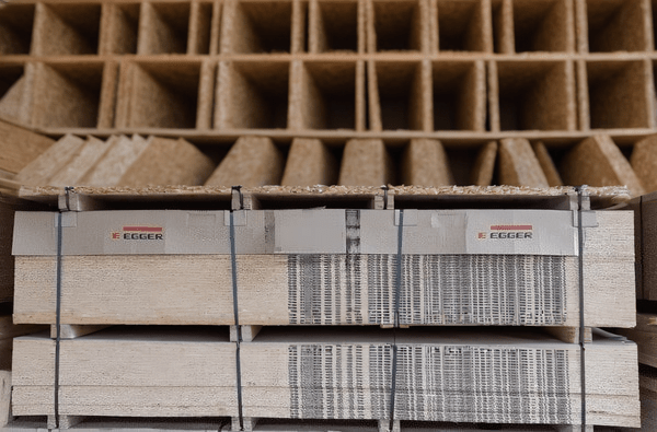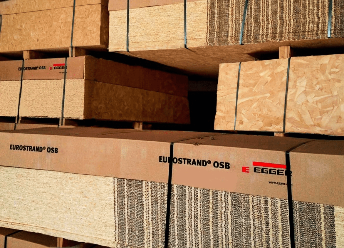 Компания Egger производит ОСБ плиту 12 используя процесс прессования. Сначала древесные стружки размалываются на мелкие частицы, затем смешиваются с воском, смолой и другими добавками, в зависимости от требуемых свойств и качества ОСБ. Затем смесь подвергается прессованию и выдерживается при высоком давлении и температуре, что приводит к формированию листов ОСБ.