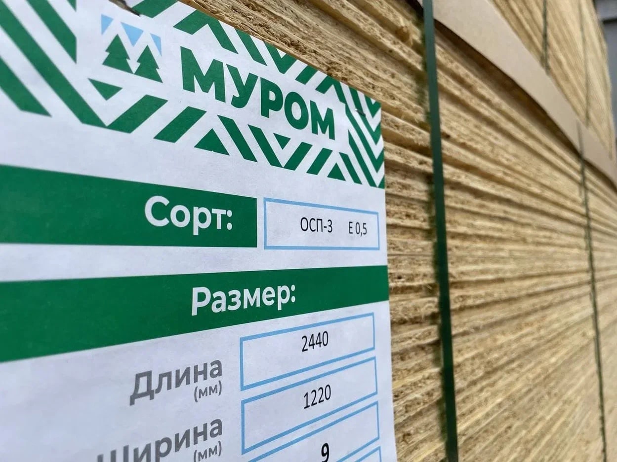 Компания "Муром ОСБ" производит лист ОСБ 8 методом непрерывного литья. Процесс начинается с загрузки древесной стружки в бункер смесителя, где она смешивается с древесной фракцией более мелкого размера и связующими веществами. Затем полученная смесь поступает на формовочную линию, где она равномерно распределяется по ширине и длине плиты с помощью вибрационных устройств и вальцов. Затем материал подвергается прессованию и обработке паром.
